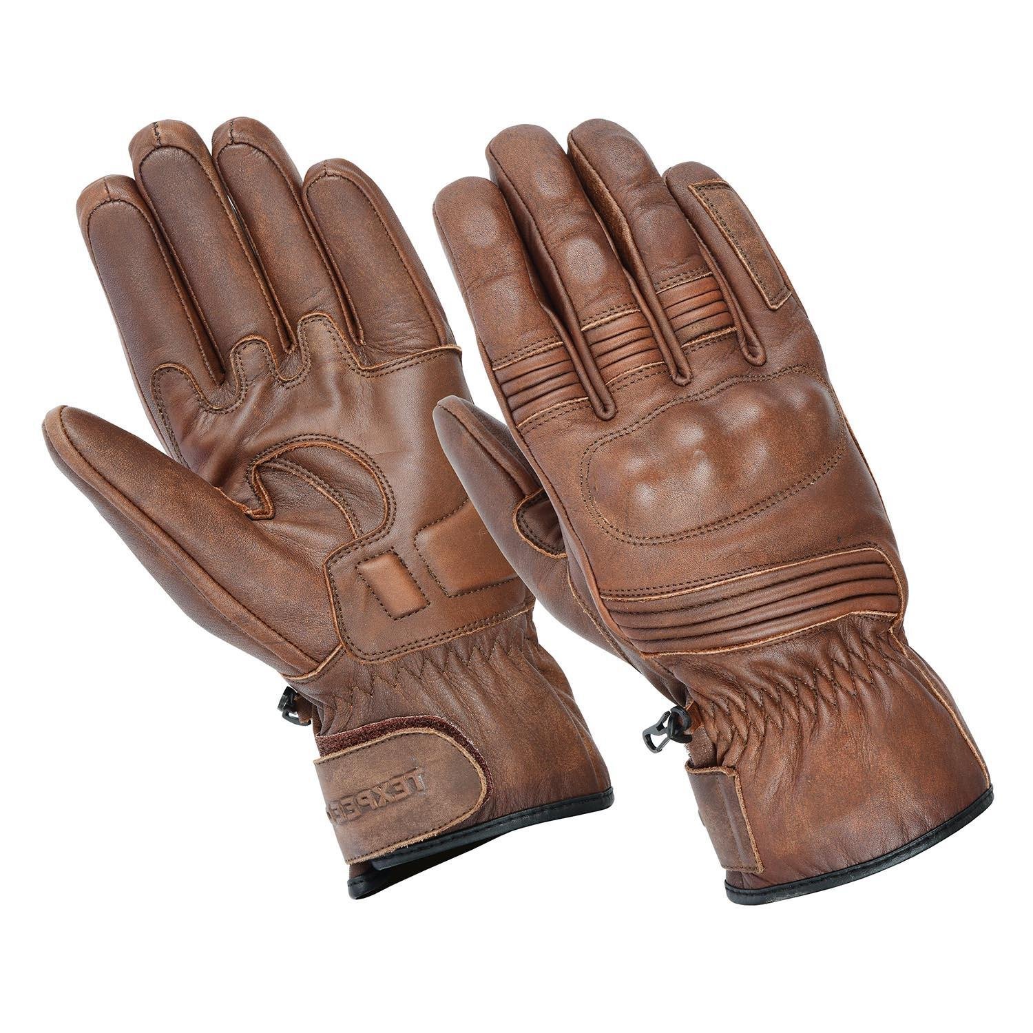 Material: 100% premium full-grain leather Safety: CE-certified protective armour at knuckles and palms Comfort: Breathable inner lining with adjustable wrist fastening Color: Rich brown finish for a refined, classic look