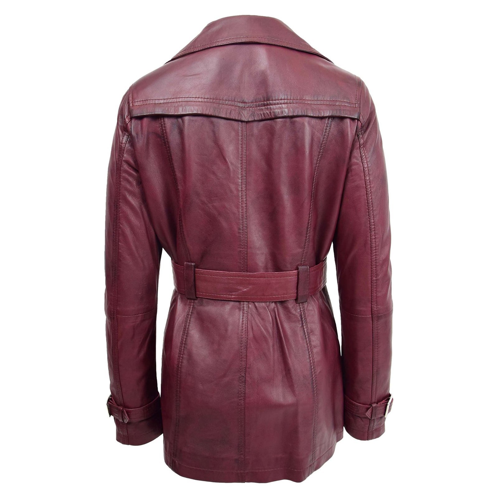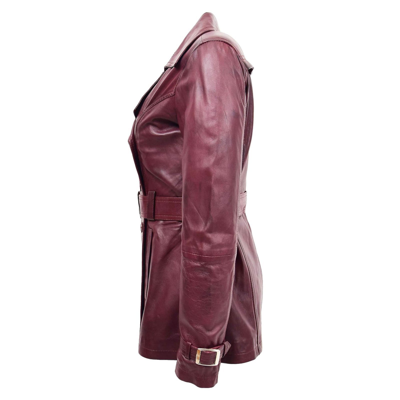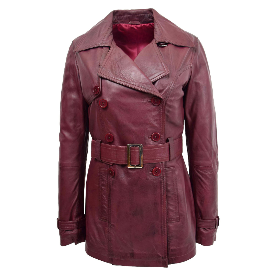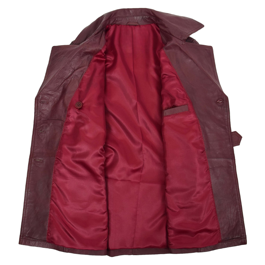 The Sienna burgundy leather trench coat blends traditional trench coat styling with the elegance of rich, wine-toned leather. It’s a refined piece that makes a statement in any wardrobe.