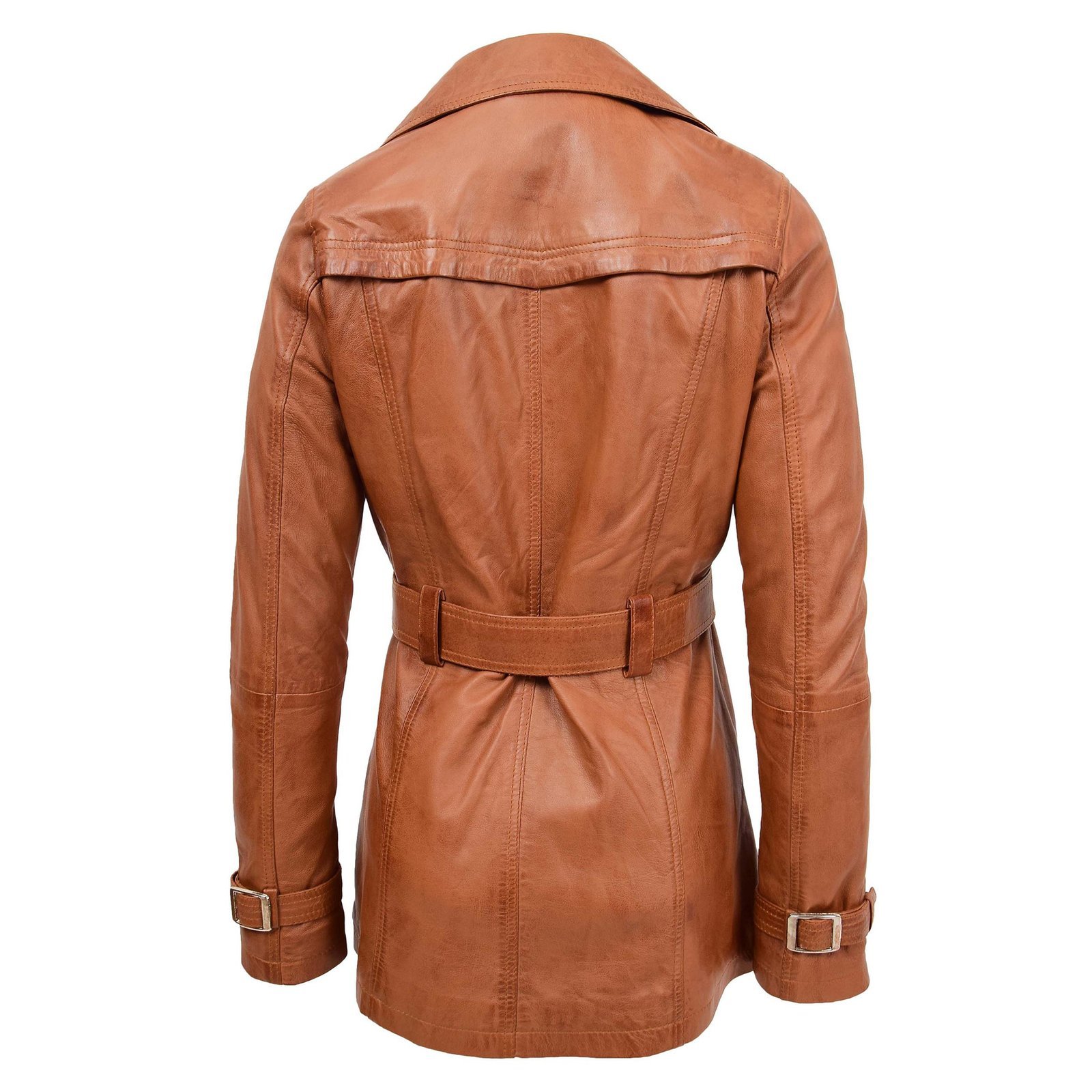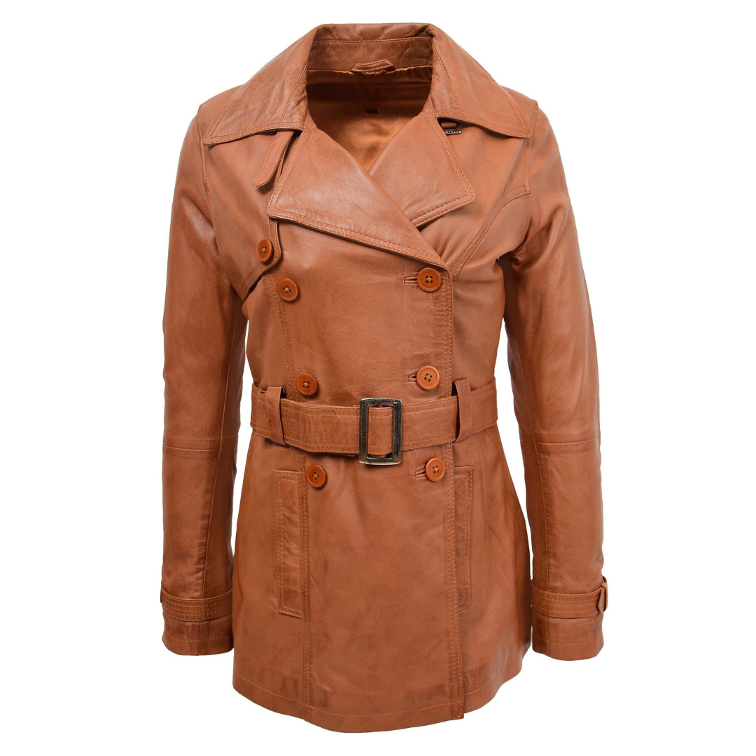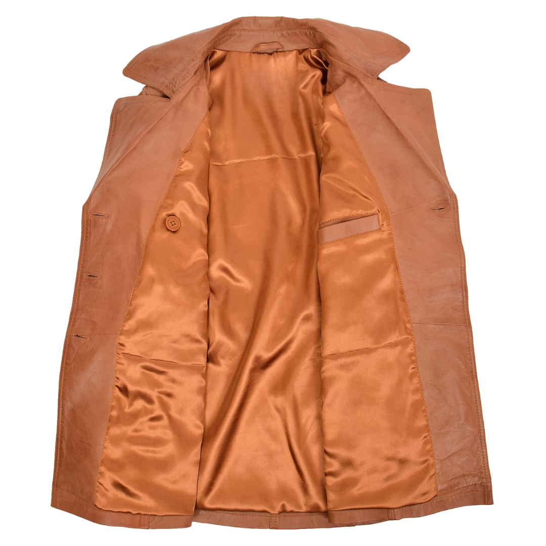 The Sienna tan trench coat combines the elegance of a traditional double-breasted trench with the luxury of genuine leather. Its structured cut and refined detailing make it a standout piece for any wardrobe.