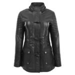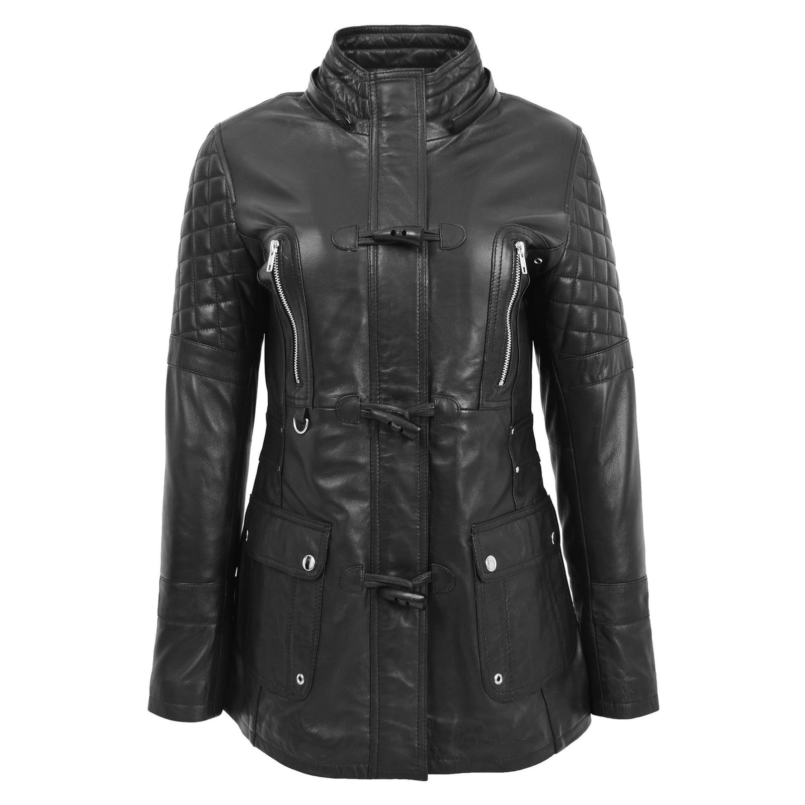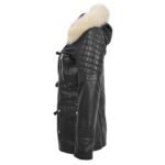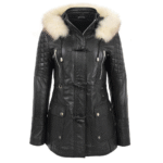 This women’s coat blends the traditional duffle design with the sophistication of genuine Ariel black leather. The iconic toggle closure adds a heritage detail, making it a refined outerwear piece with a timeless edge.